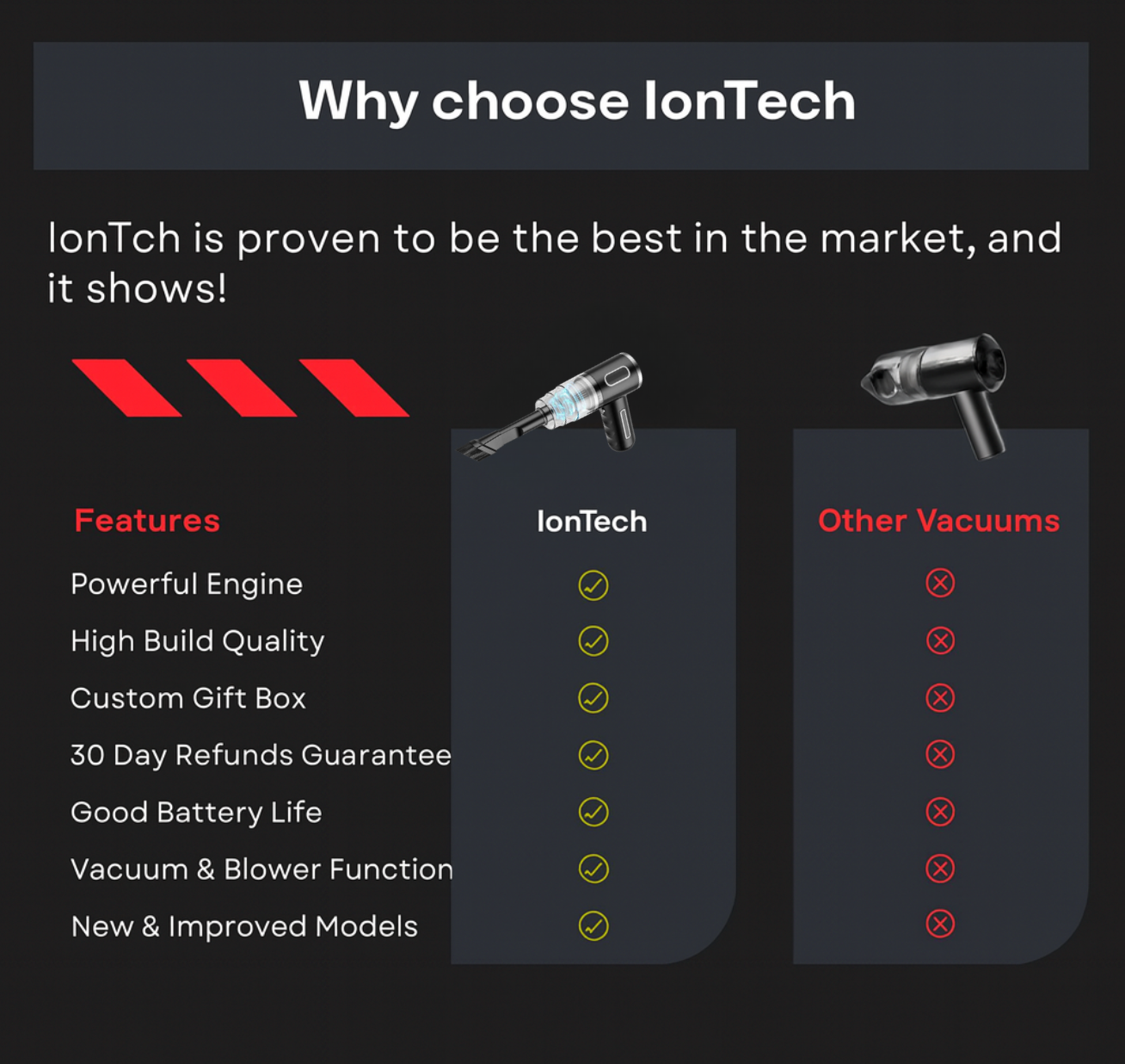 Regrettably, the market is flooded with numerous replicas of inferior, low-quality vacuums peddled by various sellers. In stark contrast, our vacuum boasts over 20 times the power, and IonTech stands as the exclusive, legitimate source of these exceptional products.